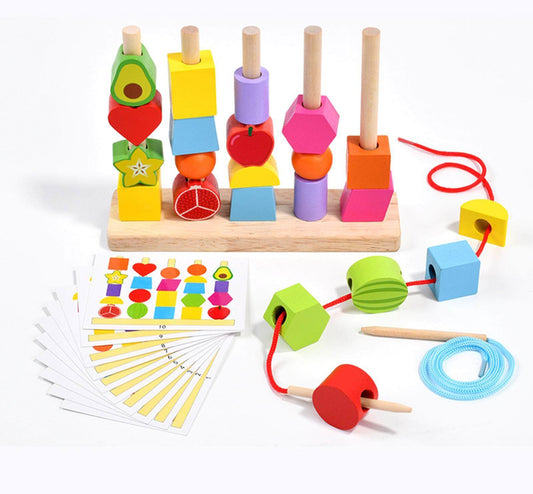 Wooden Montessori Fruits & Shapes Sequence with Lacing Pattern