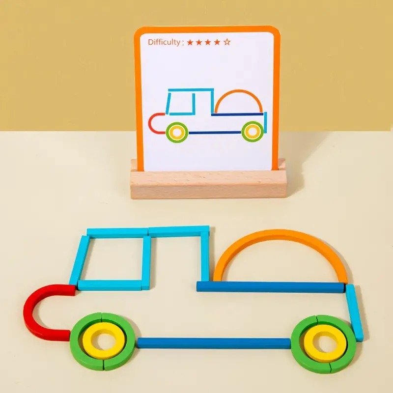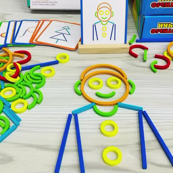 - Each side presents a unique pattern for children to replicate using wooden sticks and rings—stimulating visual perception and memory.